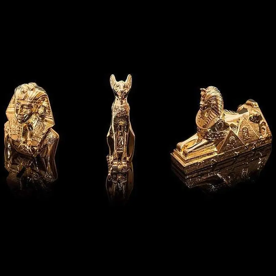 These 24K Gold embellished Egyptian ornaments are handmade in Egypt by local craftsmen Our collection of 24K Gold embellished Egyptian ornaments are handmade in Egypt by local craftsmen, who have been producing iconic ornaments for generations. Each piece has been sourced in person by our international procurement team and has been assessed for its authenticity and the skill taken to craft each piece. These are then carefully sent to our Goldprivé craftsmen who then embellish the entire ornaments in 24K Gold. Our collection includes a Tutankhamun Bust, a Great Sphinx of Giza ornament, and a Mau figurine that completes the set of luxury ornaments that are sacred to ancient Egyptian society and culture.