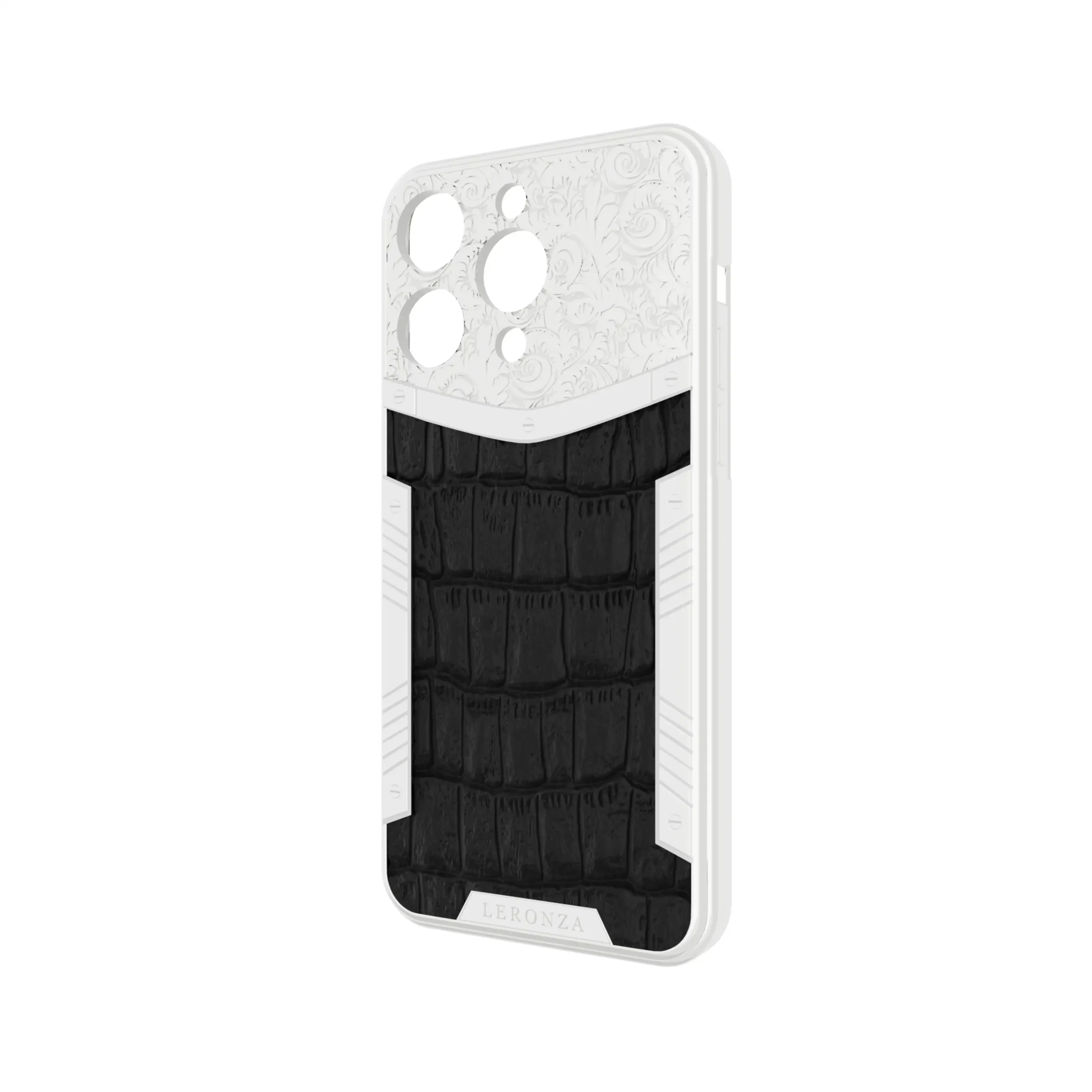 Experience unparalleled luxury with the Goldprivé 24K Gold Apple iPhone Exotic Royale flora leather Case. Meticulously plated in 24K Gold and Platinum (5-7 microns thick), it exudes lasting shine and elegance. The design is further enhanced with real crocodile leather skin, intricately customized with a baroque-inspired flora design. Personalize it by engraving your name or initials on the backplate or frame.