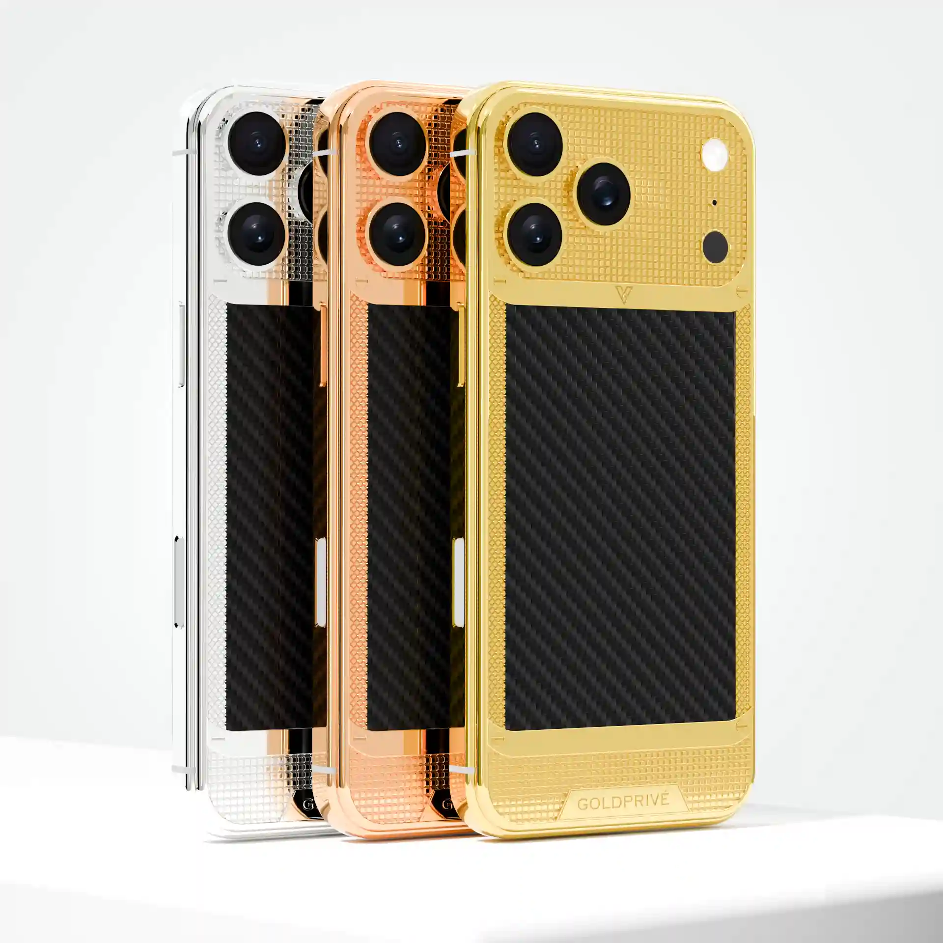 The GoldPrivé 24K Gold Apple iPhone 17 Pro & Pro Max CarbonFiber Victory Edition embodies strength, resilience, and uncompromising luxury. The case and backplate are precision-plated in 24K Gold, Rose Gold, or Platinum, with a refined 5–7 micron thickness for lasting brilliance and durability.