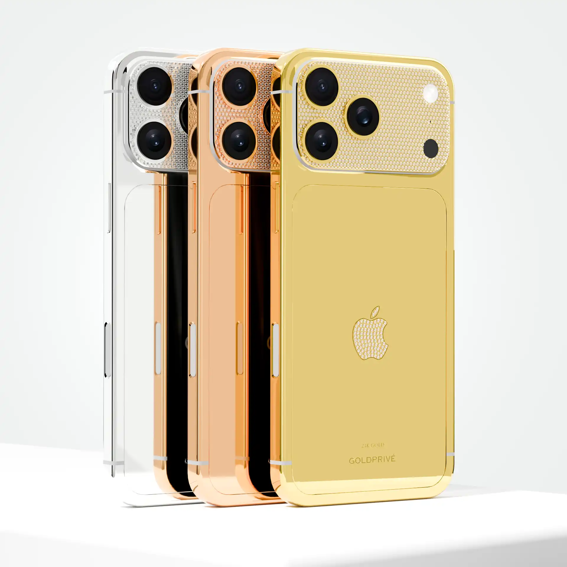 At the center, a diamond-aligned Apple logo—set with simulated or VS1 diamonds—creates a striking focal point of elegance and prestige. This exclusive creation from GoldPrive also offers bespoke customization, allowing you to incorporate your own logo, name, or initials in dazzling diamonds—transforming your iPhone into a powerful personal statement of luxury.