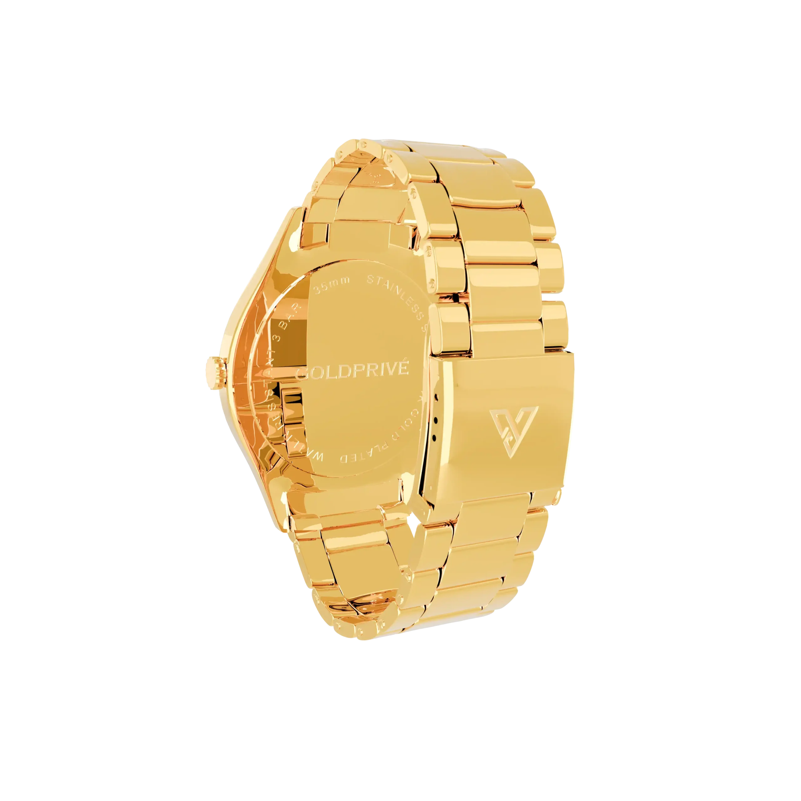 This GoldPrivé timepiece is enhanced with world-class plating options, including 24K Gold, Rose Gold, and Platinum finishes. The stainless steel bracelet and dial can also be personalized with Swarovski crystals or VS1 diamonds, transforming the watch into a truly bespoke luxury accessory crafted for discerning individuals who value exclusivity and refined craftsmanship.