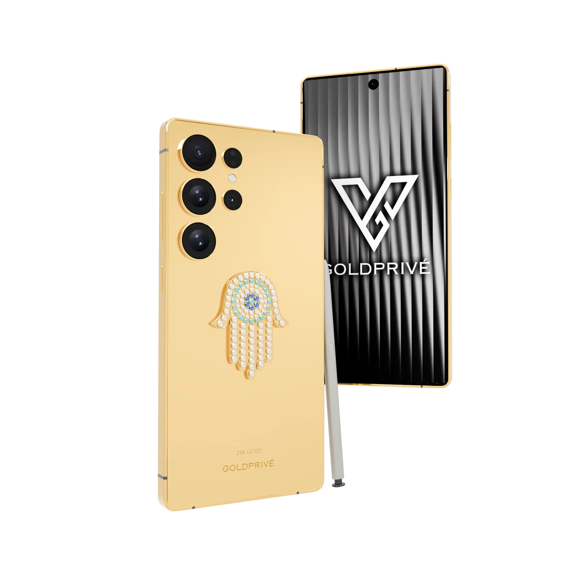 Experience luxury redefined with the Solid 24k Gold Samsung Galaxy S26 Ultra Seraphic Hamsa Blessing.