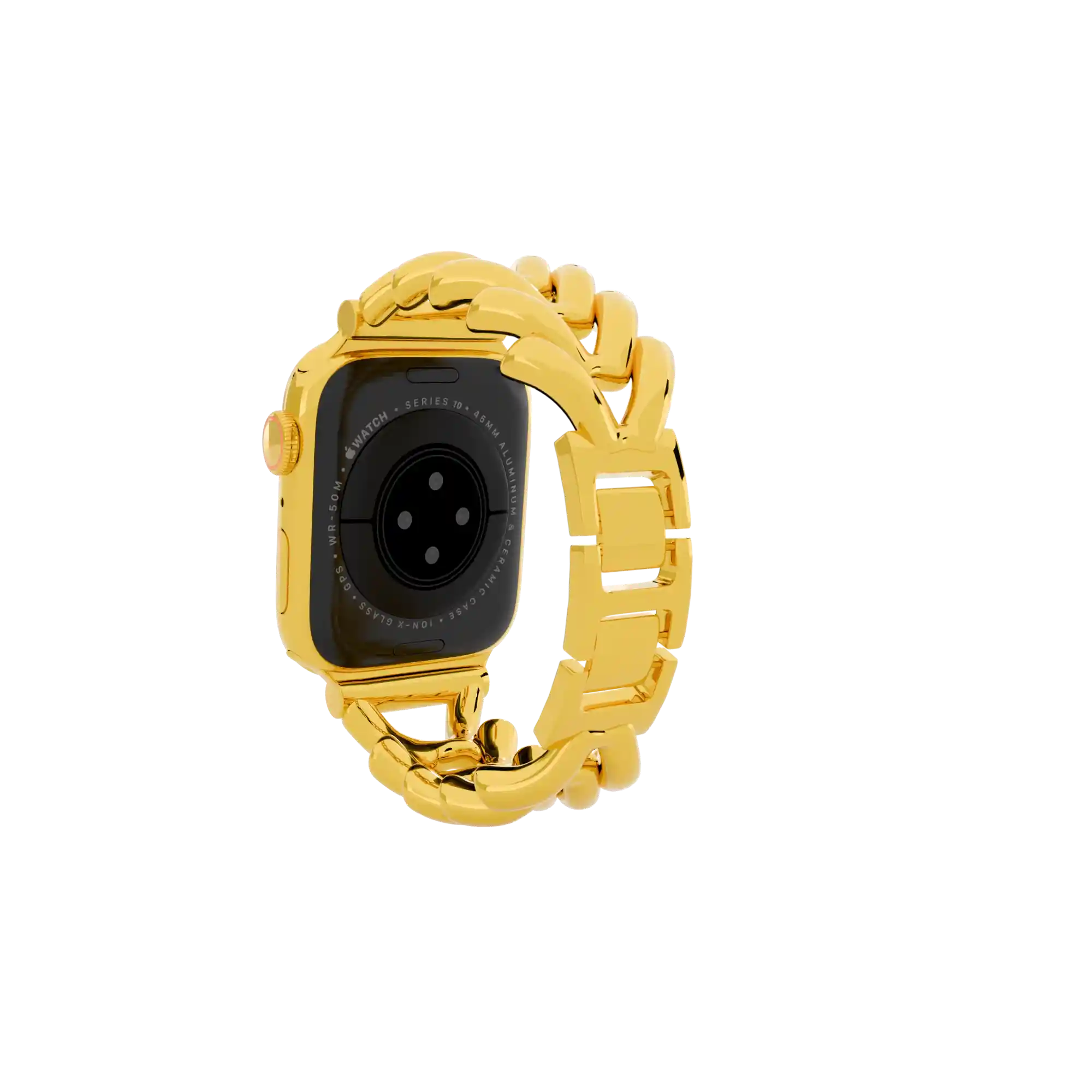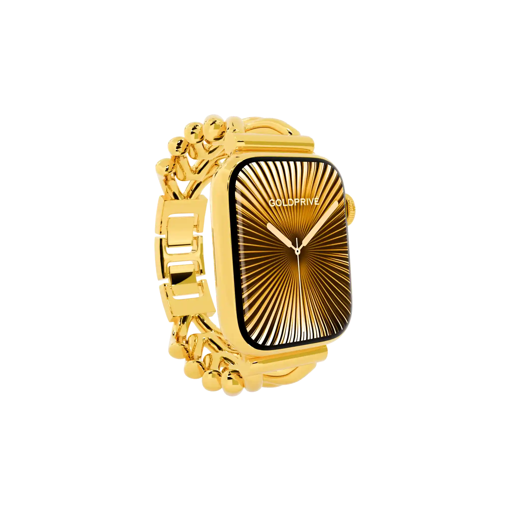 The GoldPrivé 24K Gold Apple Watch Series 11 – Glamour Bracelet Edition reflects exceptional craftsmanship through its premium plating process, available in 24K Gold, Rose Gold, and Platinum. Each finish is meticulously applied with a refined 5–7 micron thickness, ensuring lasting durability and a radiant, mirror-like brilliance.